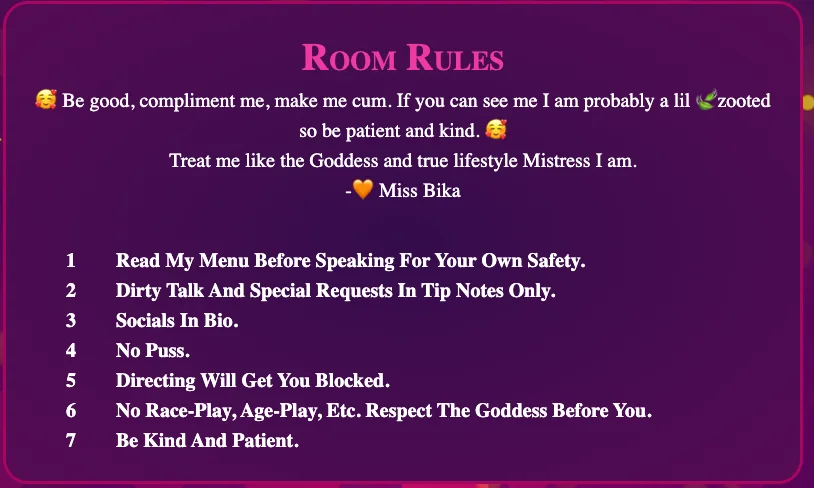 Firm and direct,, super kink-positive, experienced Femdomme and Findomme who can be described as knowledgeable, shy, but eternally curious, hedonistic, ethereal, highly edible, and Dominant Mistress with a soft sadistic side; I am deserving of incessant worship + adoration. My attention is earned. I may look cute and femme, especially on this platform, but that doesn’t mean I will take your ish, hesitate to rob you blind, or let you bother anyone else in my room. Read my rules. Be kind.